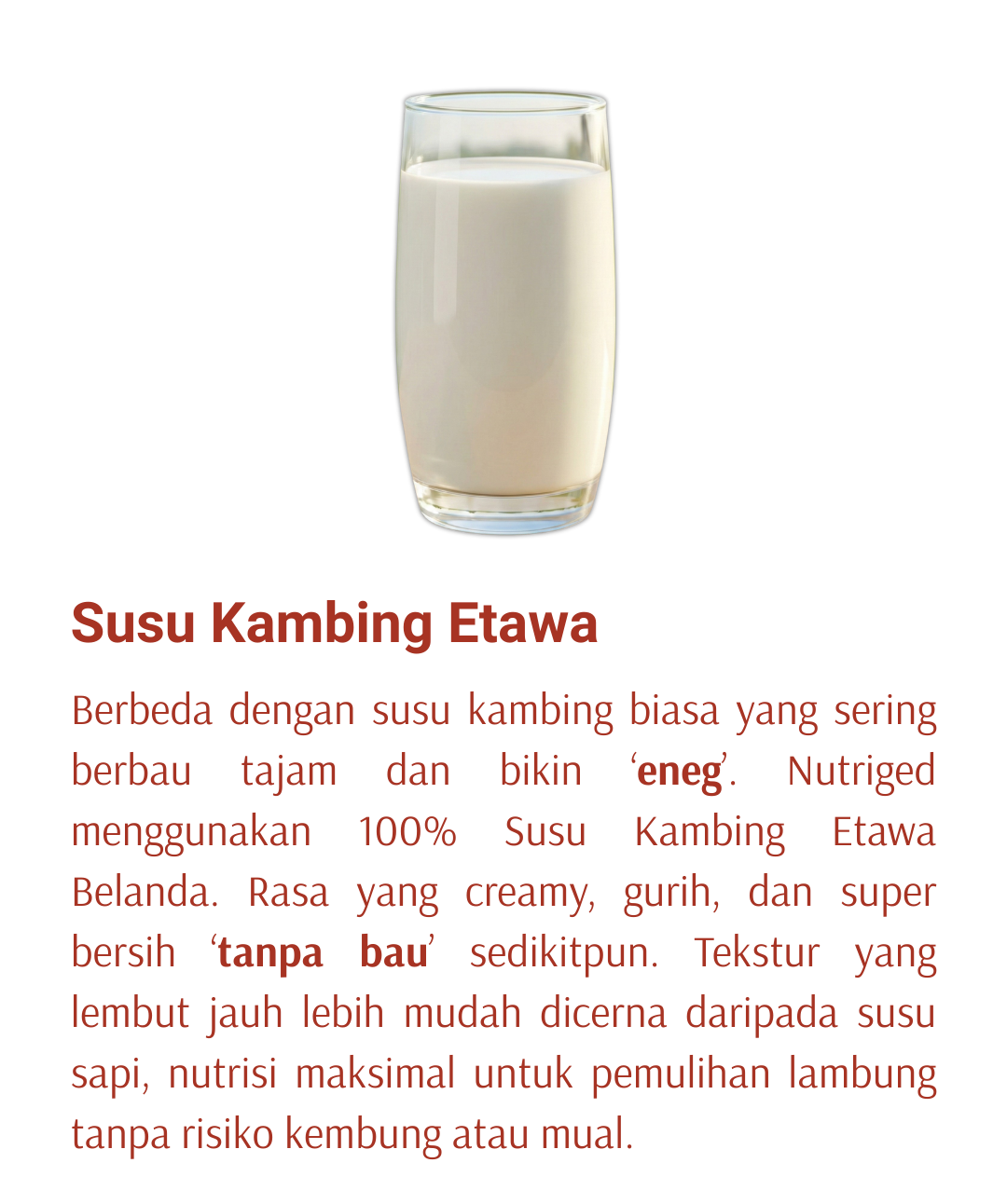 Berbeda dengan susu kambing biasa yang sering berbau tajam dan bikin ‘eneg’. Nutriged menggunakan 100% Susu Kambing Etawa Belanda. Rasa yang creamy, gurih, dan super bersih ‘tanpa bau’ sedikitpun. Tekstur yang lembut jauh lebih mudah dicerna daripada susu sapi, nutrisi maksimal untuk pemulihan lambung tanpa risiko kembung atau mual.